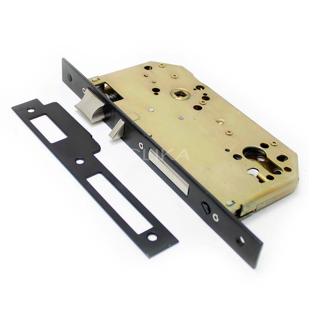 Com dispositivo anti cartão e anti-pânico, para cilindro de perfil europeu, com 6 cm de distância da testa à broca e acabamento negro.