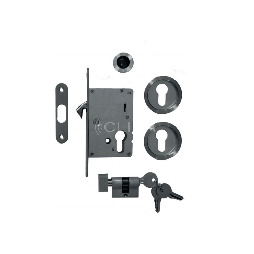 Fechadura de embutir com chave e cilindro com botão.